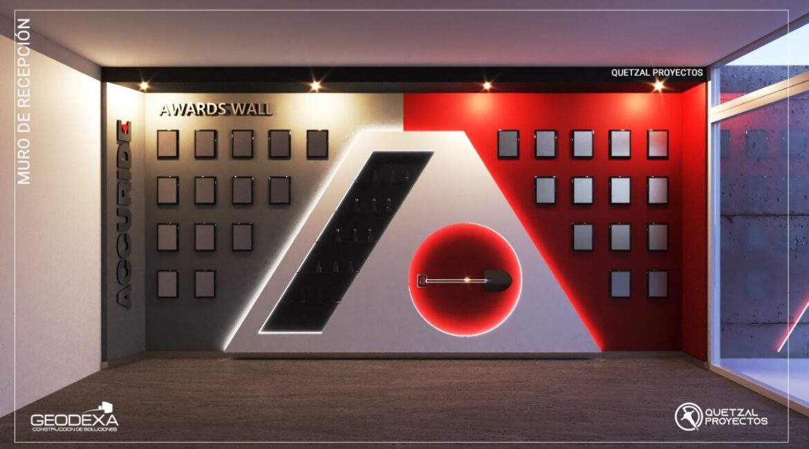 Muro de reconocimientos en área de recepción en oficinas industriales